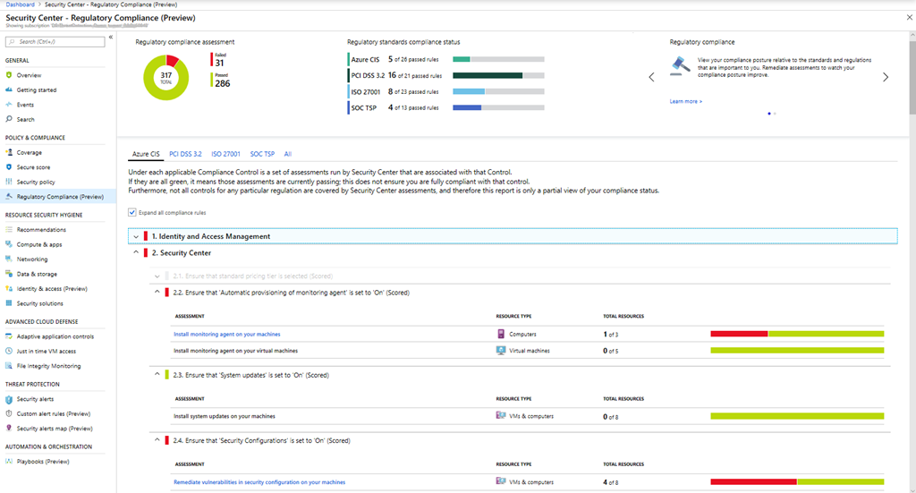 The same thinking and process can be applied to Azure. Use Defender for Cloud-Regulatory Compliance to determine a compliance score similar to the same score provided in the Purview Compliance Manager. The score is aligned to multiple regulatory standards and frameworks across various industry verticals. It's up to your organization to understand which of these regulatory standards and frameworks apply to the score. The status provided by this dashboard displays a constant real-time assessment of passing versus failing assessments with each standard. Here's an example.