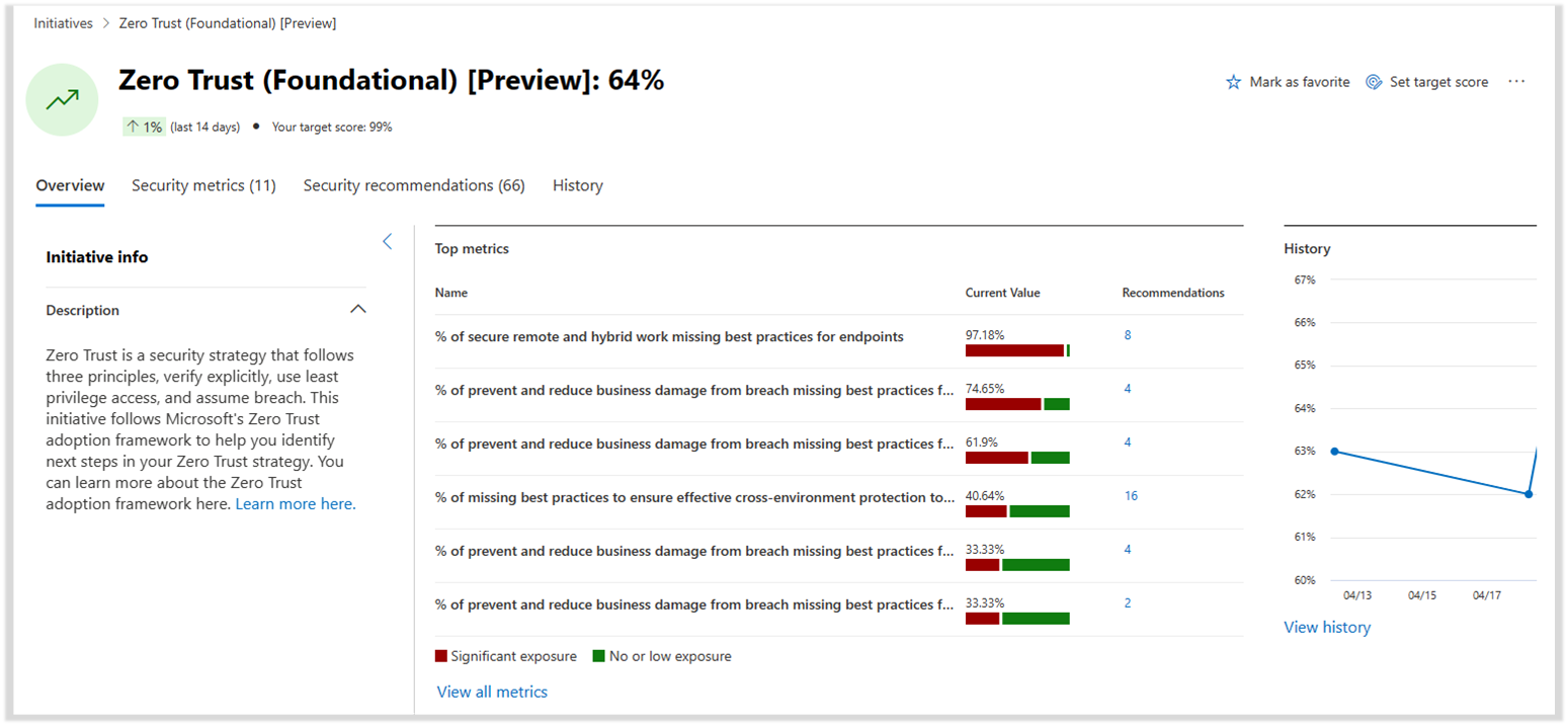 Use the Zero Trust initiative to track your organization’s progress toward implementing Zero Trust security. This initiative is aligned with this Microsoft Zero Trust adoption framework, allowing you to track your progress with metrics aligned with business scenarios. These metrics capture your resource coverage across prioritized actionable recommendations to help security teams protect their organization. The initiative also provides real-time data on your Zero Trust progress that can be shared with stakeholders.