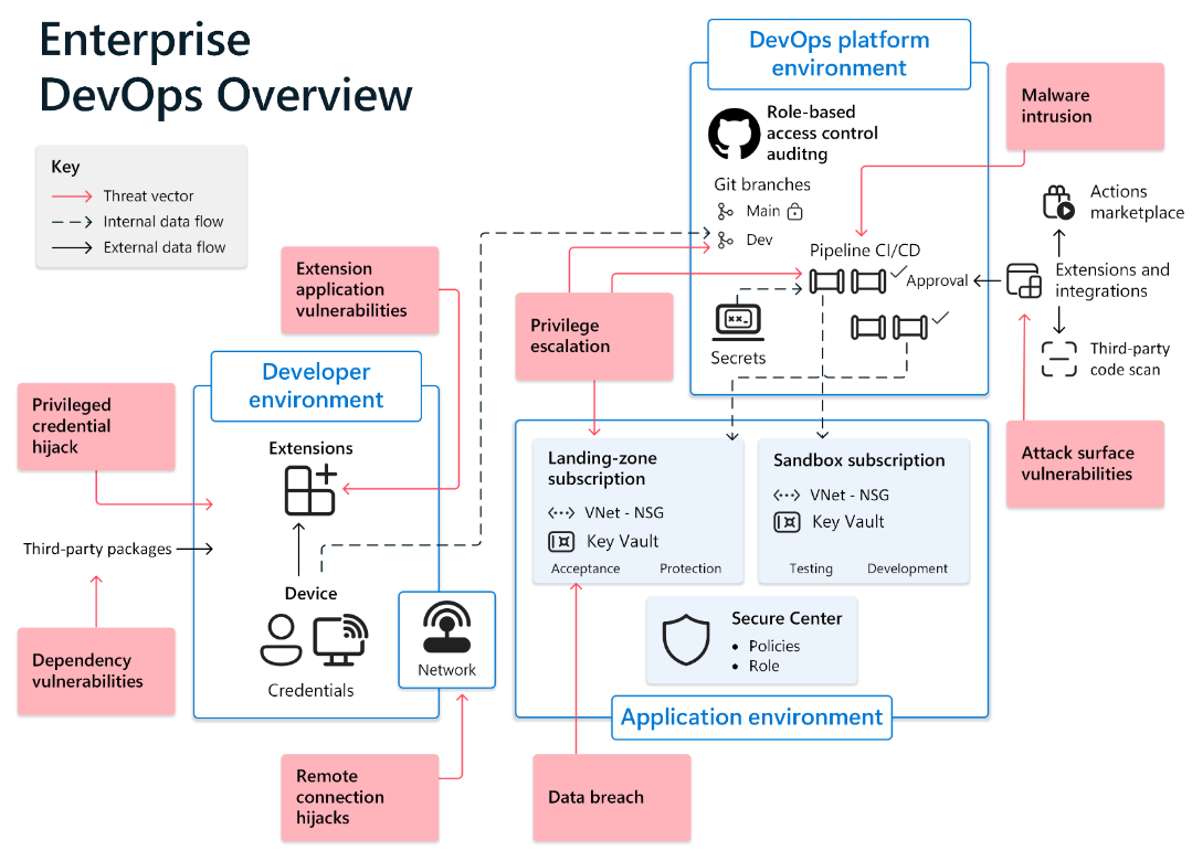 In the following diagram, notice how the developer environment connects to the DevOps tools environment to affect Git branches. It widens the environment surface through connection to open-source packages and application extensions. Extensions present vulnerabilities in dependency and extension application vulnerabilities.