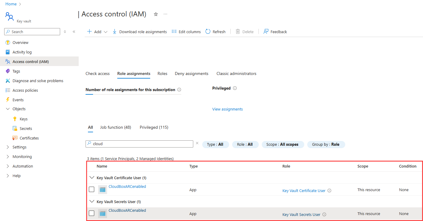 5. In the portal, navigate to the Azure Key Vault instance where the certificate is stored, and grant access to the Azure Machine resource(s). In your Azure Key Vault navigation menu, navigate to Settings, and Access configuration. For detailed steps to manage role assignments, review Assign Azure roles using the Azure portal.