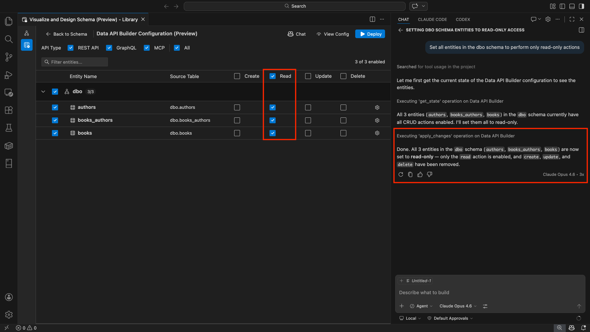 The MSSQL extension for Visual Studio Code includes an integrated UI for Data API builder, so you can create REST, GraphQL, and MCP endpoints for your SQL database tables without writing configuration files or leaving Visual Studio Code. You can select which tables to expose, configure CRUD permissions, choose API types, preview the generated configuration, and deploy a local backend powered by Data API builder, all from a visual interface.
