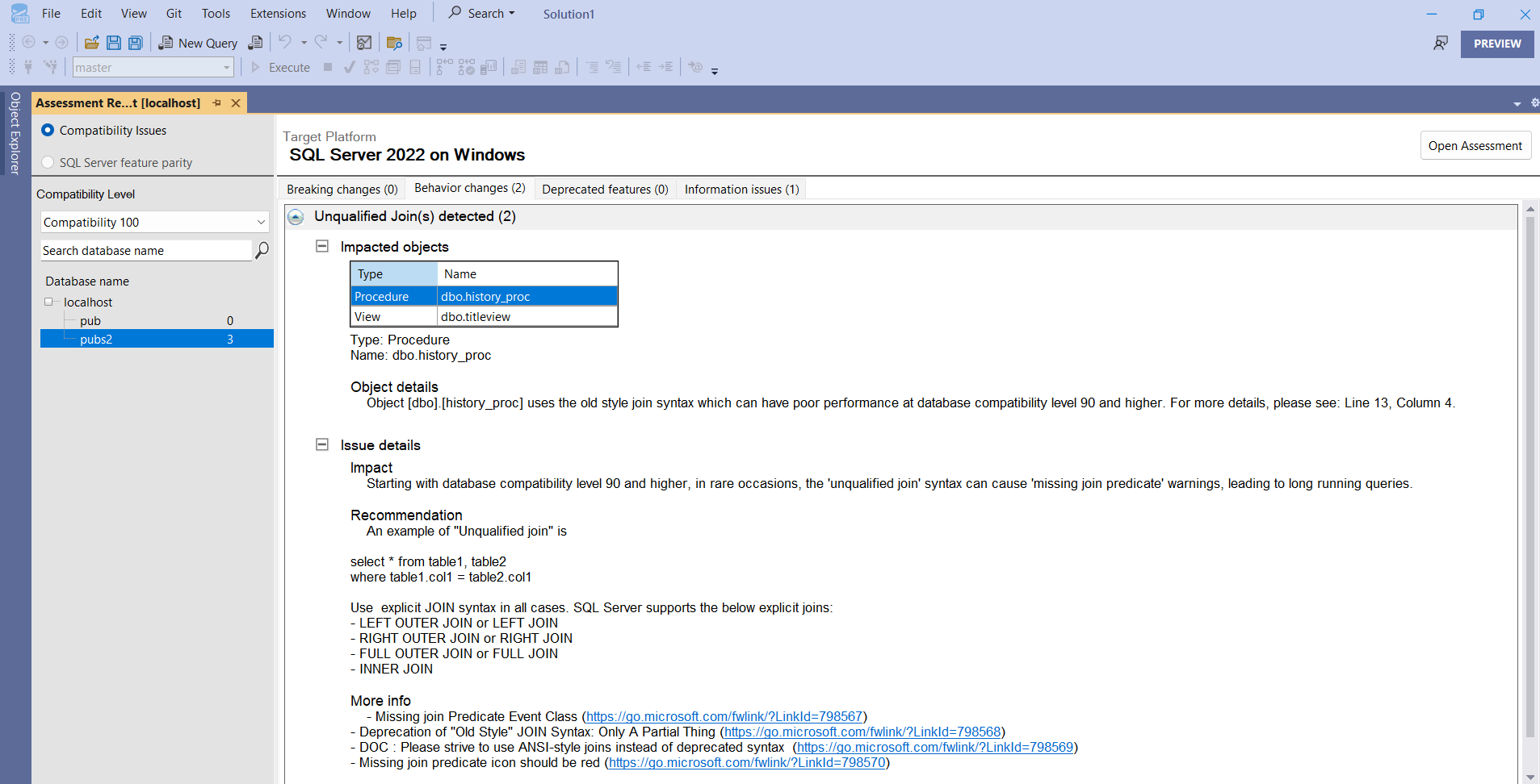 The migration component in SQL Server Management Studio (SSMS) checks upgrade and compatibility issues from lower versions of SQL Server to higher versions of SQL Server, running on-premises and on other virtual machine (VM) environments. The migration component finds compatibility issues related to breaking changes, behavior changes, deprecated features, and other information. The report also provides a feature parity check if you want to migrate from one cross-platform database to another. The upgrade adviser assessment report provides the effect of objects, the possible cause, and remediation steps.