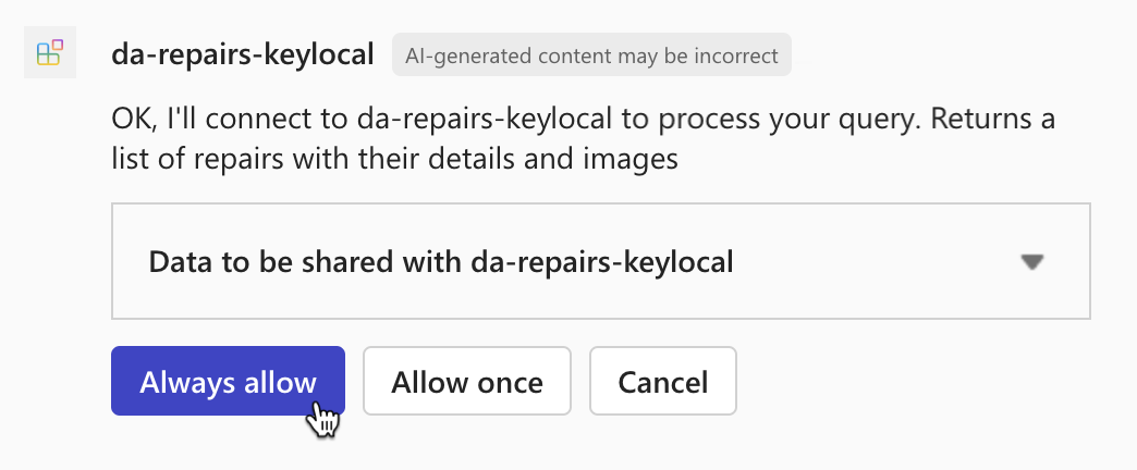 What repairs are assigned to Karin?and submit the prompt.Confirm that you want to send data to the API plugin using the Always allow button.