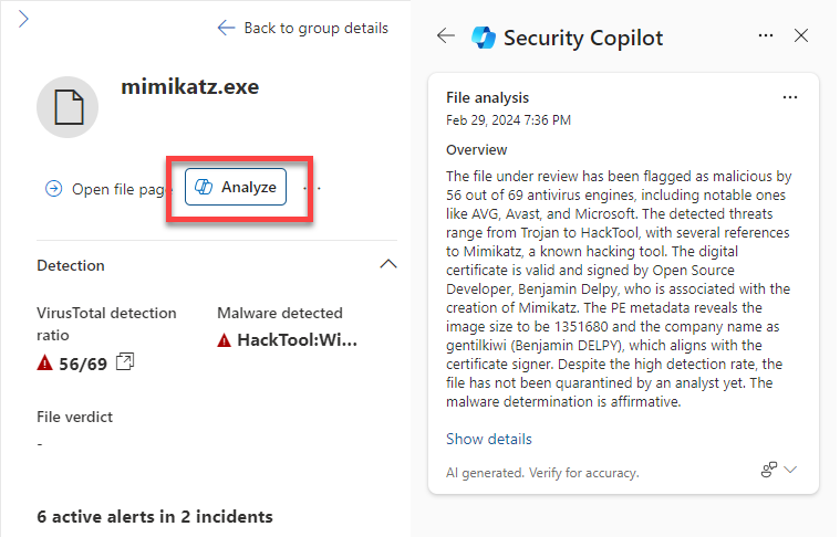 Sophisticated attacks often use files that mimic legitimate or system files to avoid detection. Copilot in Microsoft Defender XDR enables security teams to quickly identify malicious and suspicious files through AI-powered file analysis capabilities.