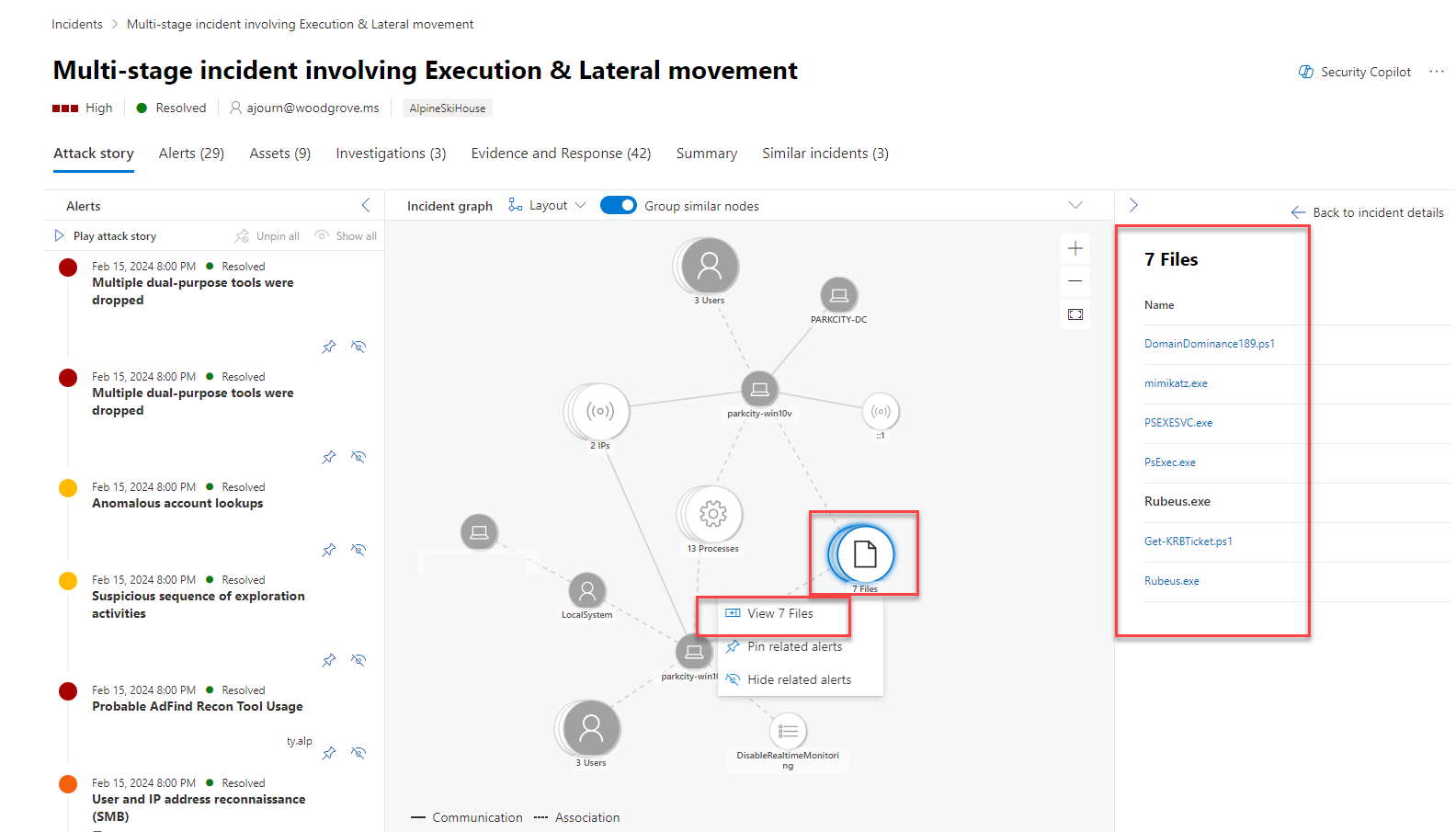In this example, you navigate to files through the incident graph of an incident with impacted files. The incident graph shows the full scope of the attack, how the attack spread through your network over time, where it started, and how far the attacker went.