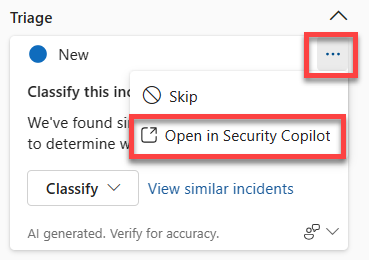 For content generated through the embedded experience you can easily transition to the standalone experience. To move to the standalone experience, select the ellipses within the generated content window then choose Open in Security Copilot.