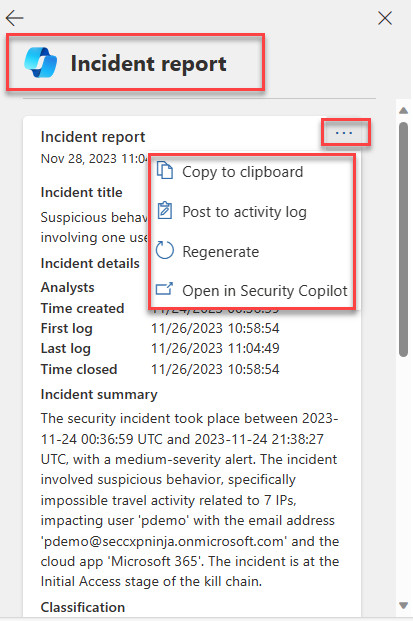 The generated report depends on the incident information available from Microsoft Defender XDR and Microsoft Sentinel. By selecting the ellipses on the incident report card, the user can copy the report to the clipboard, post to an activity log, regenerate the report, or opt to open in the Copilot standalone experience.