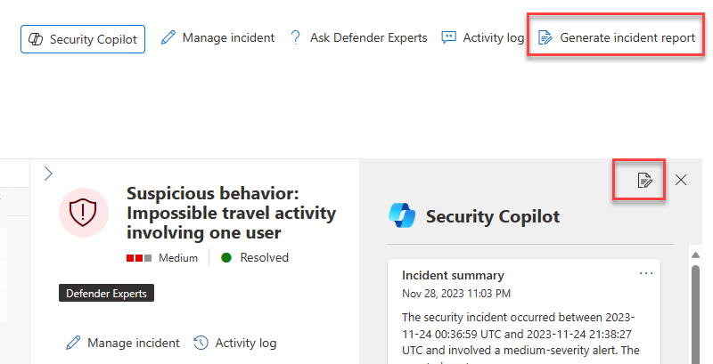 To create an incident report, the user selects Generate incident report on the top right corner of the incident page or the icon in the Copilot pane.
