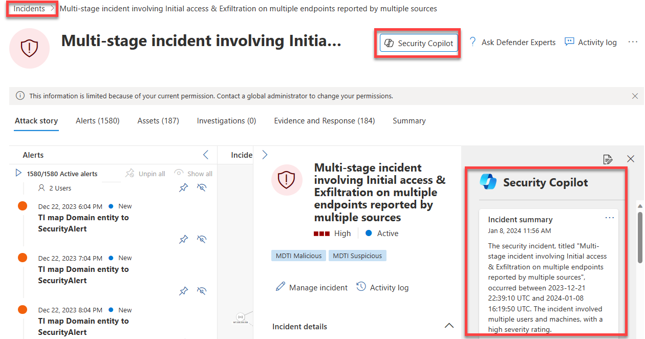Security Copilot capabilities embedded in Microsoft Defender XDR include: