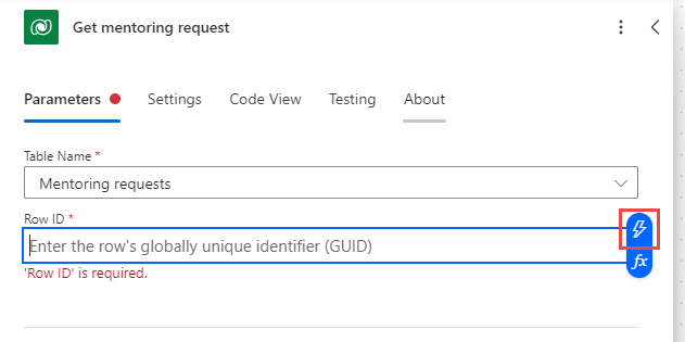 Select Requested By Email of the Get mentoring request step from the Get mentoring request action. Usually, this request goes to the person who manages mentoring requests, but to make testing easier, you use the requester's email for this exercise.