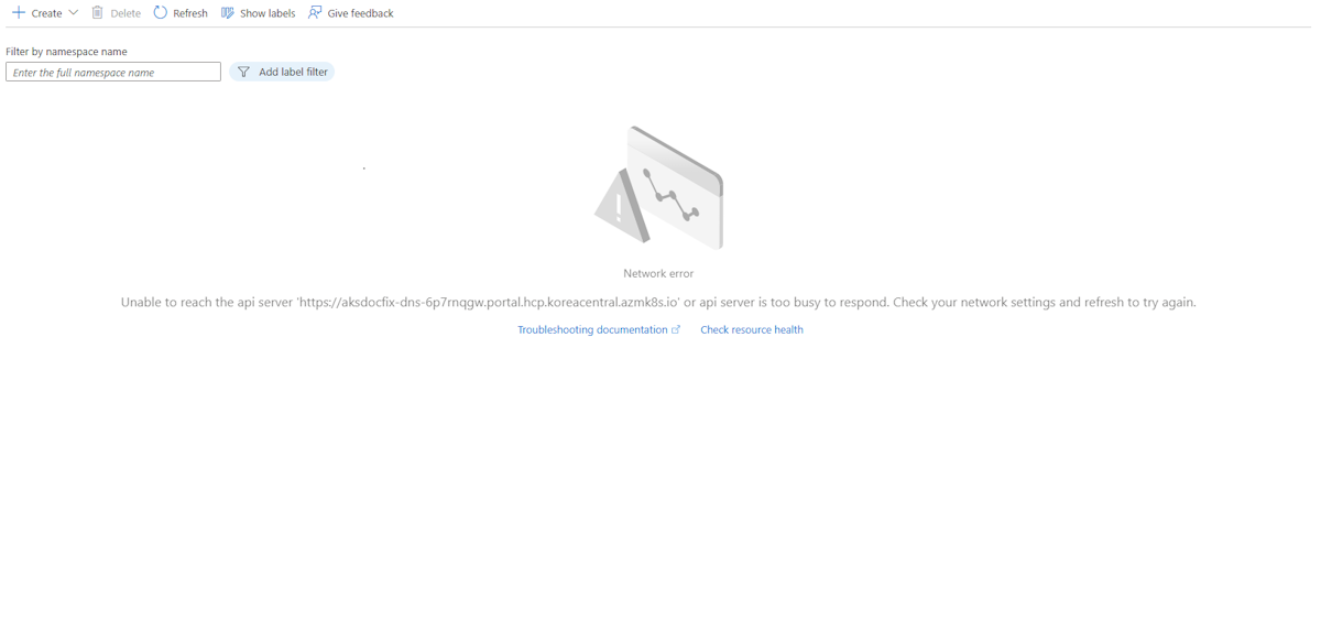 Unable to reach the api server 'https://<API-server-FQDN>' or api server is too busy to respond. Check your network settings and refresh to try again.