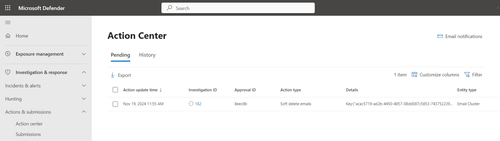 Screenshot of the Action Center page in the Microsoft Defender portal