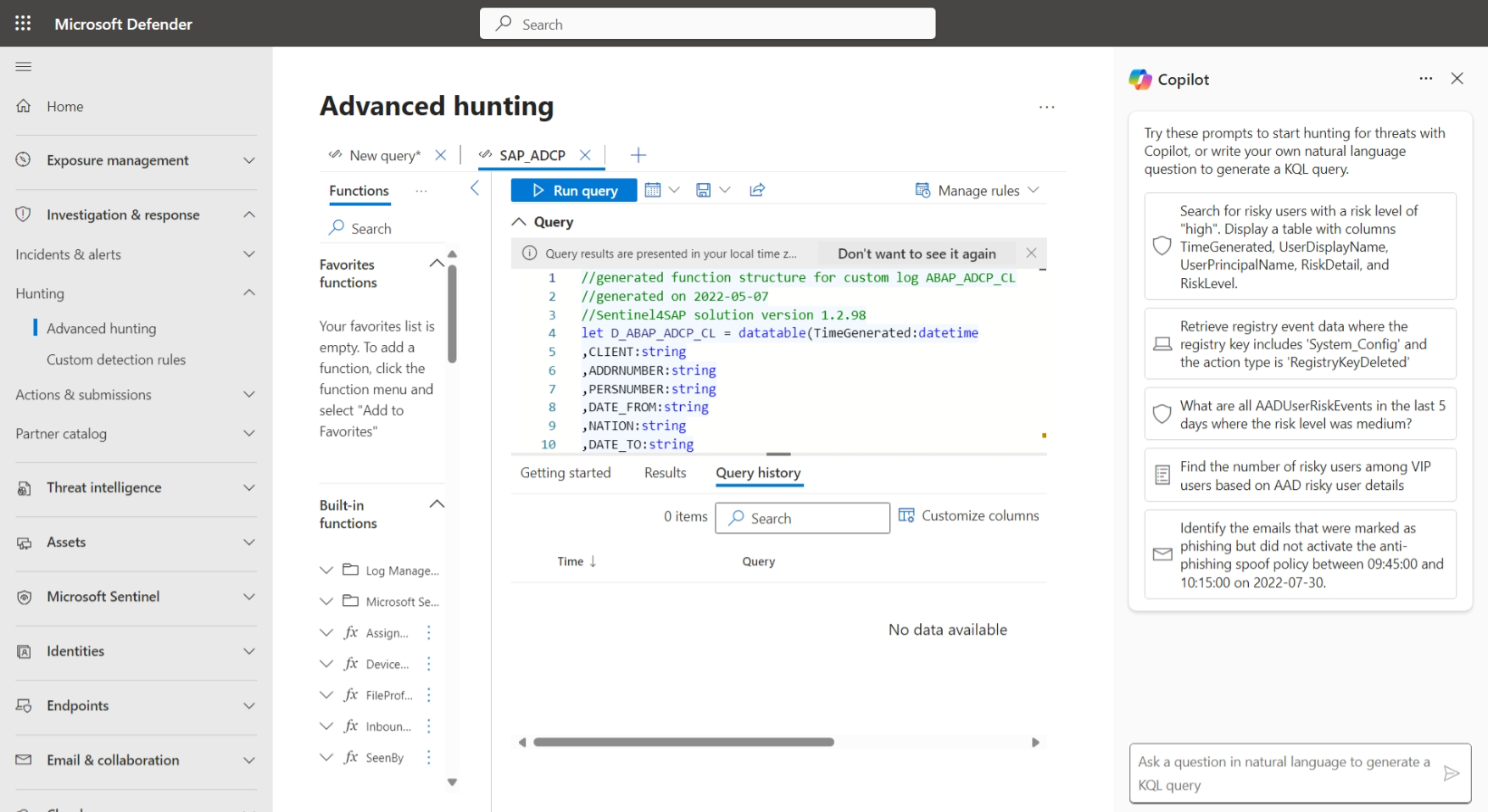 Screenshot of the Advanted Hunting page in the Microsoft Defender portal