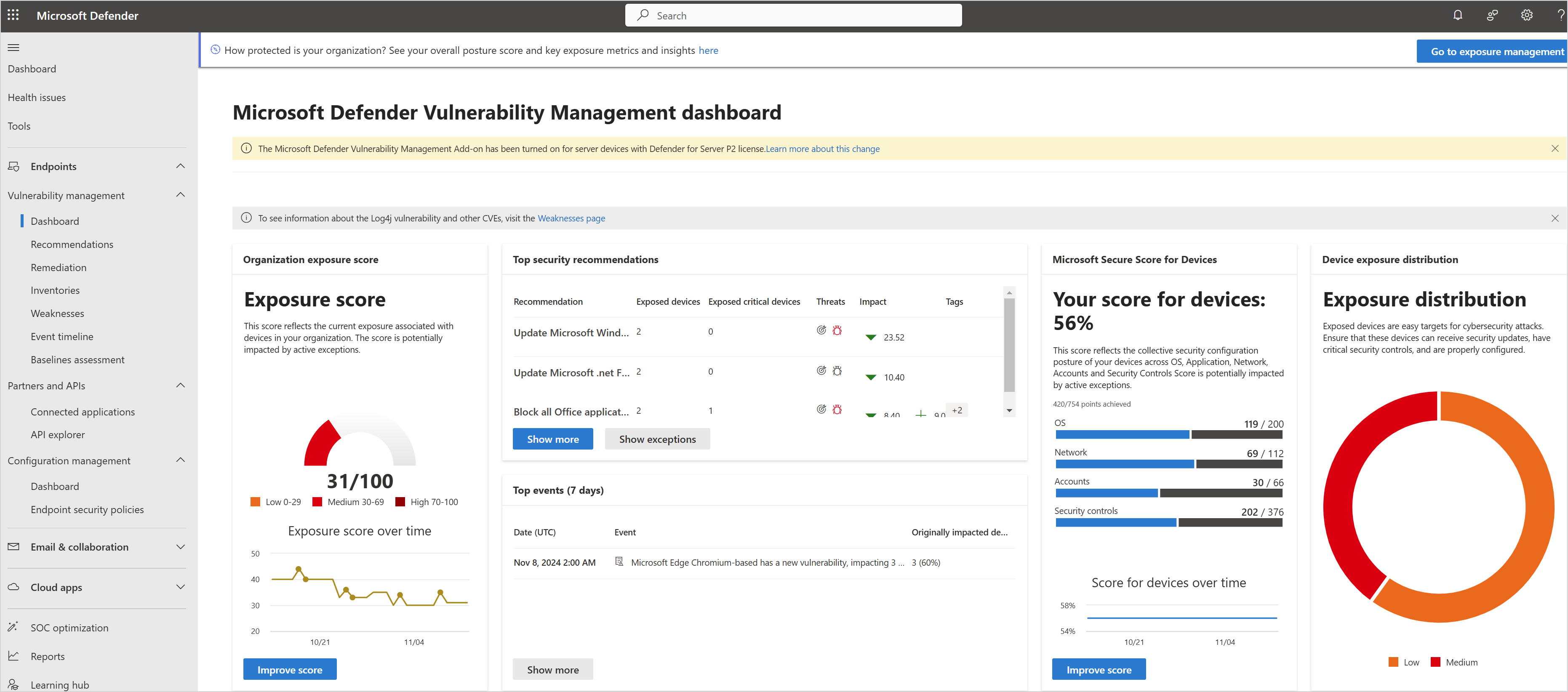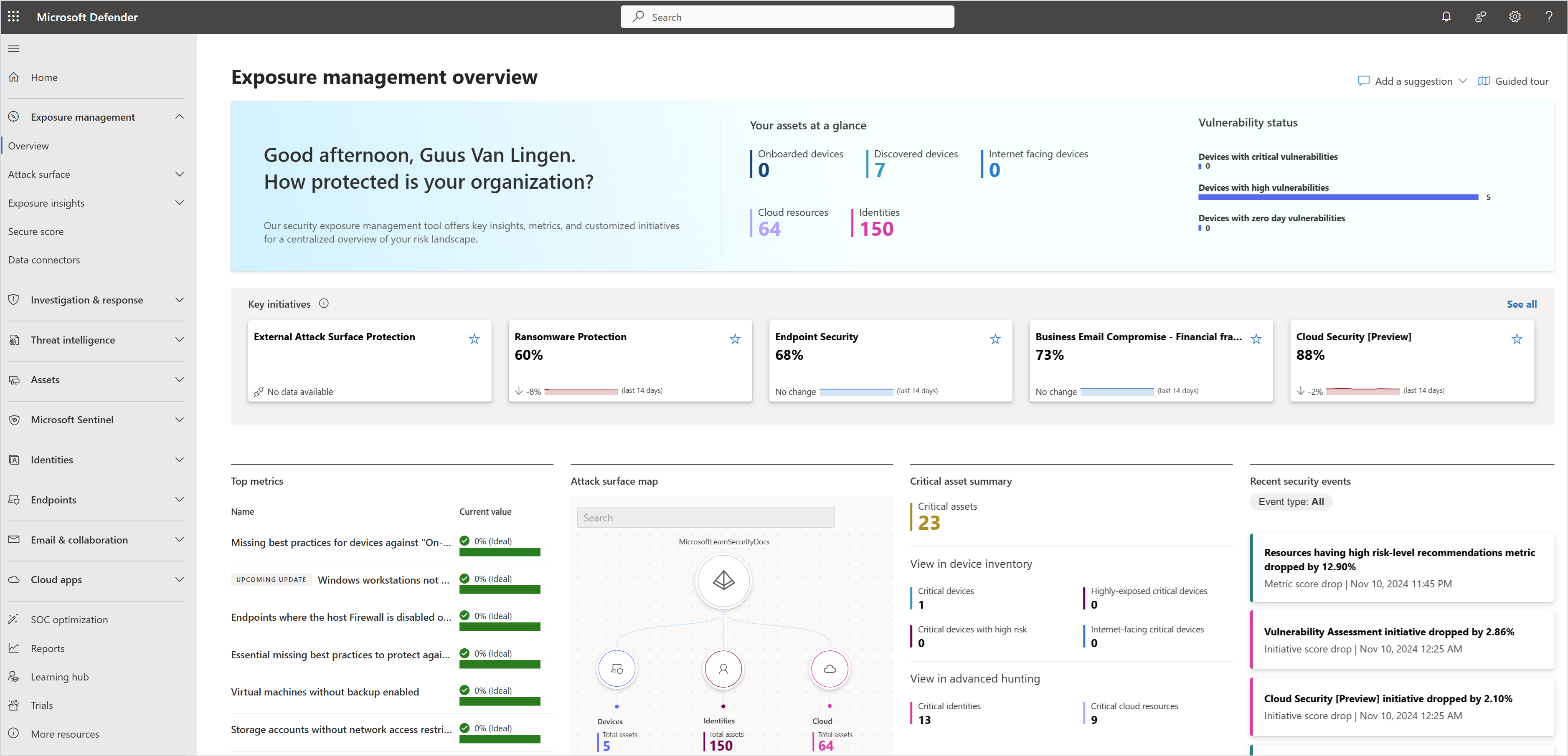 Exposure management overview This dashboard provides a quick view of devices and cloud resources, including internet-facing devices and critical assets. Learn how well your key security initiatives are doing and drill down into top metrics for high-value vulnerabilities. Get exposure levels for different types of resources, and track security progress over time.