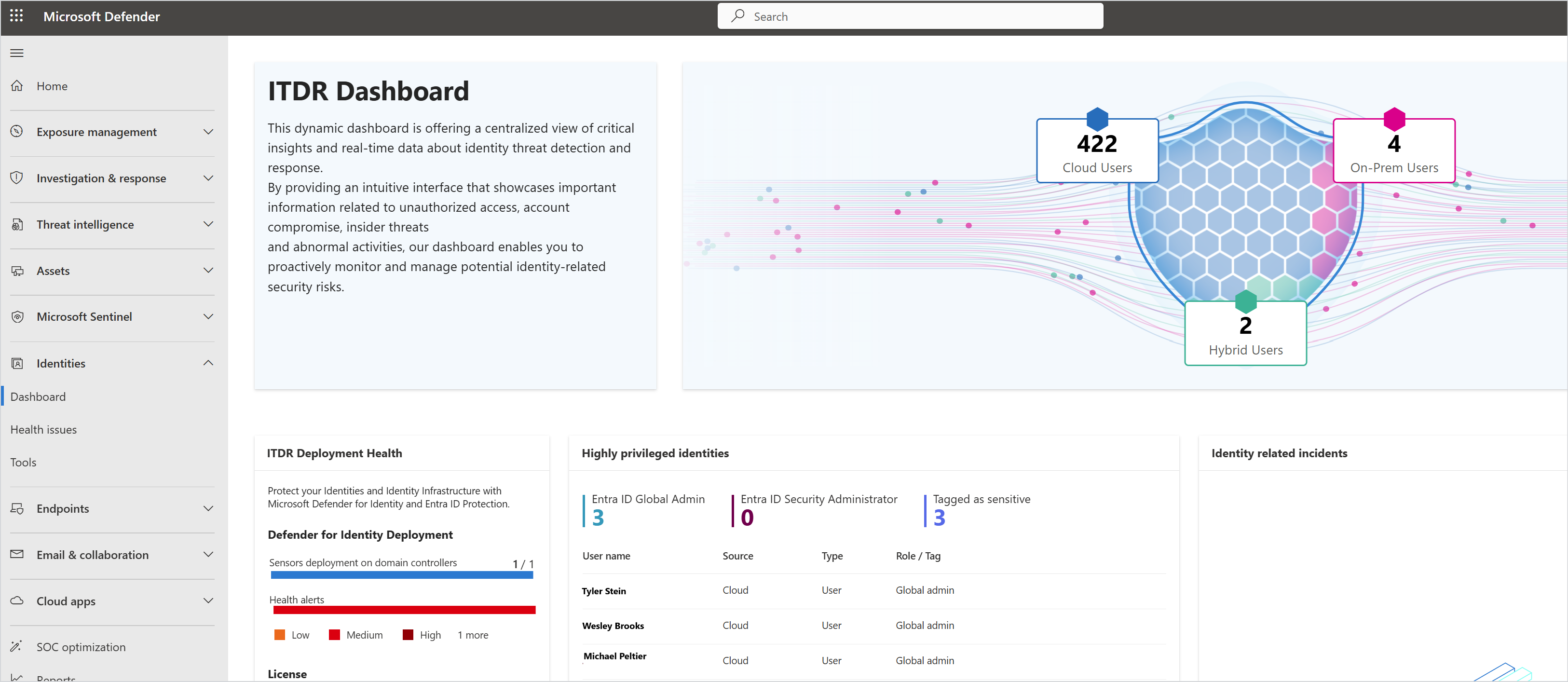 The dashboard includes information about Defender for Identity deployment, information about highly privileged identities, and information about identity-related incidents.