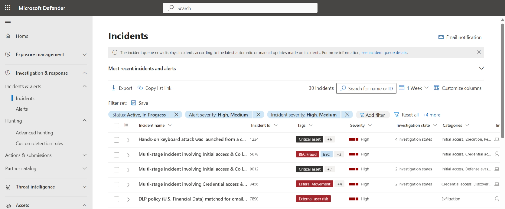 Manage and investigate security incidents in a single location and from a single queue in the Defender portal. The Incidents and Alerts queues shows current security incidents and alerts across your services.