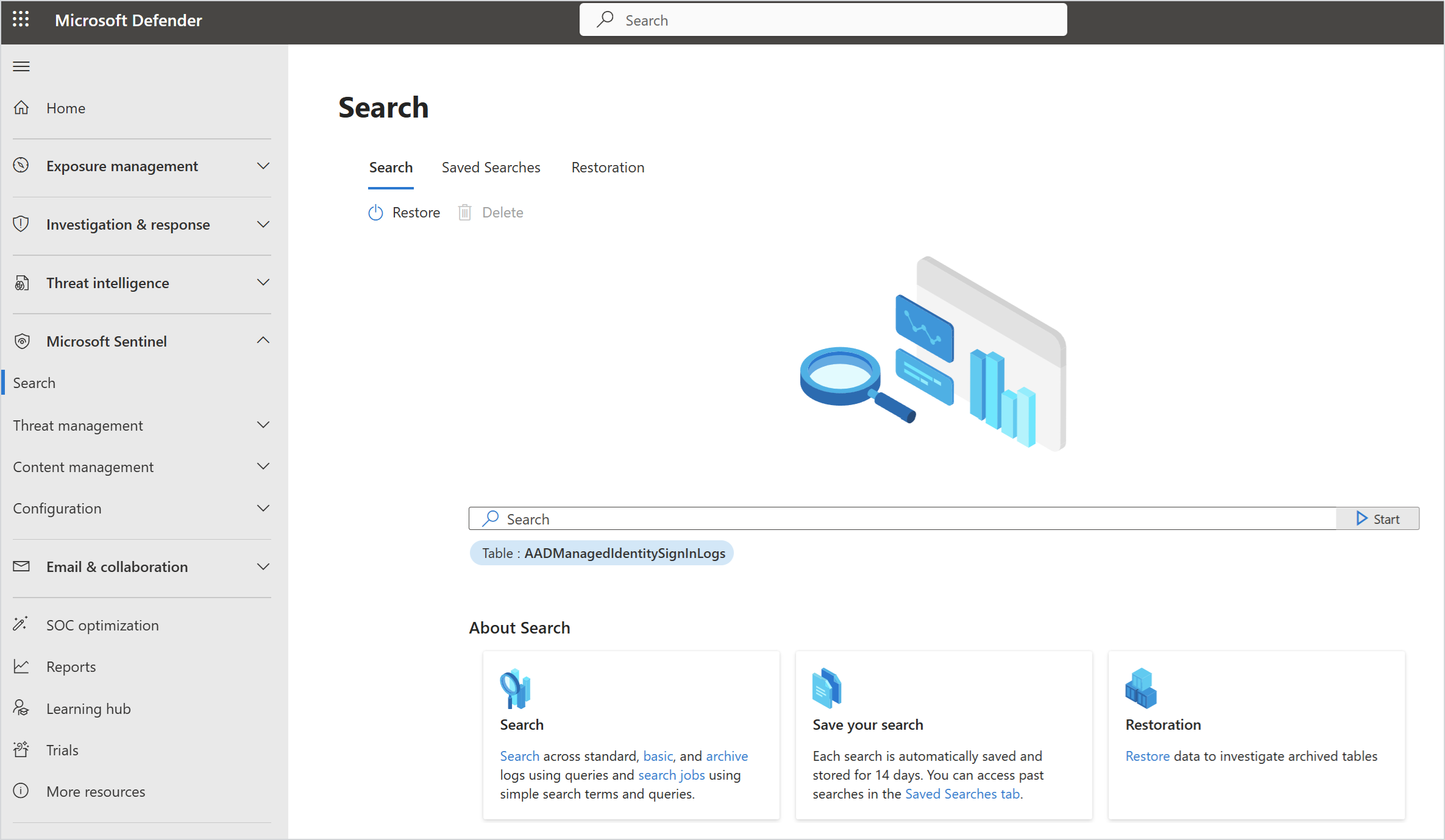Screenshot of the Sentinel Search page in the Microsoft Defender portal