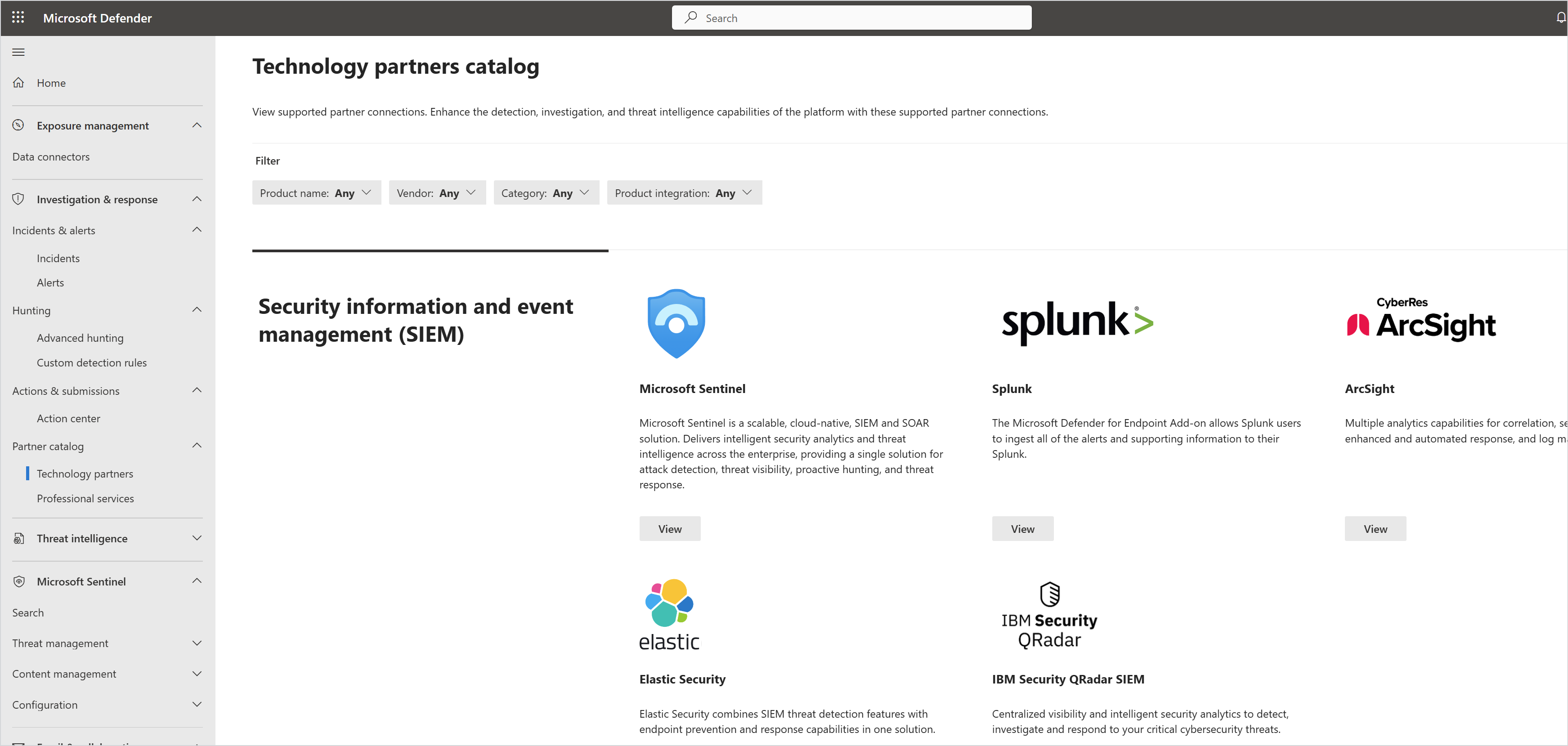 Screenshot of the Technology Partners page in the Microsoft Defender portal
