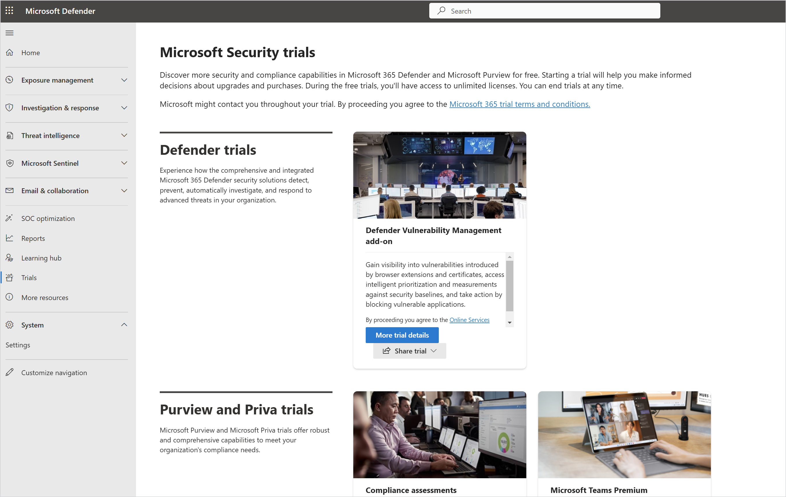 Screenshot of the  page Microsoft Security Trials page in the Microsoft Defender portal