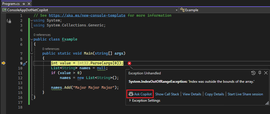 IndexOutOfRangeExceptionoccurs and the app pauses, showing the exception.To get AI assistance for the exception, continue to the next section.