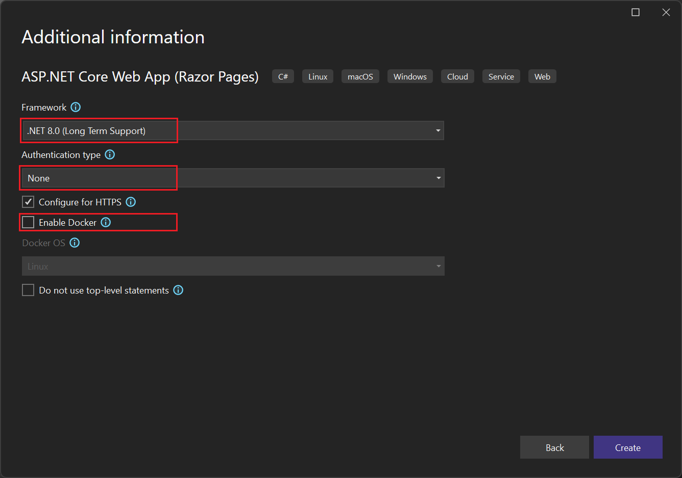 In the Additional information window, verify that .NET 8.0 appears in the Target Framework field.