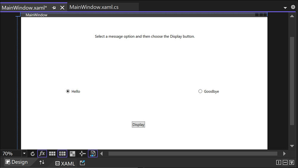 <Grid> <TextBlock HorizontalAlignment="Left" Margin="252,47,0,0" TextWrapping="Wrap" Text="Select a message option and then choose the Display button." VerticalAlignment="Top"/> <RadioButton x:Name="HelloButton" Content="Hello" IsChecked="True" HorizontalAlignment="Left" Margin="297,161,0,0" VerticalAlignment="Top"/> <RadioButton x:Name="GoodbyeButton" Content="Goodbye" HorizontalAlignment="Left" Margin="488,161,0,0" VerticalAlignment="Top"/> <Button Content="Display" HorizontalAlignment="Left" Margin="377,270,0,0" VerticalAlignment="Top" Width="75"/> </Grid>