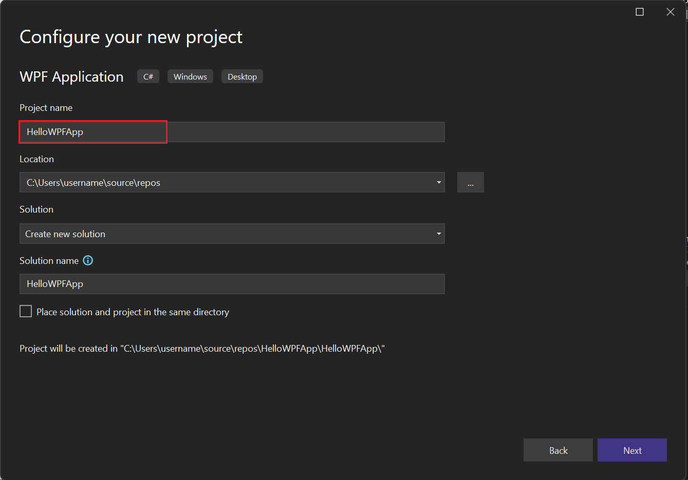 At the next screen, give the project a name, HelloWPFApp, and choose Next.