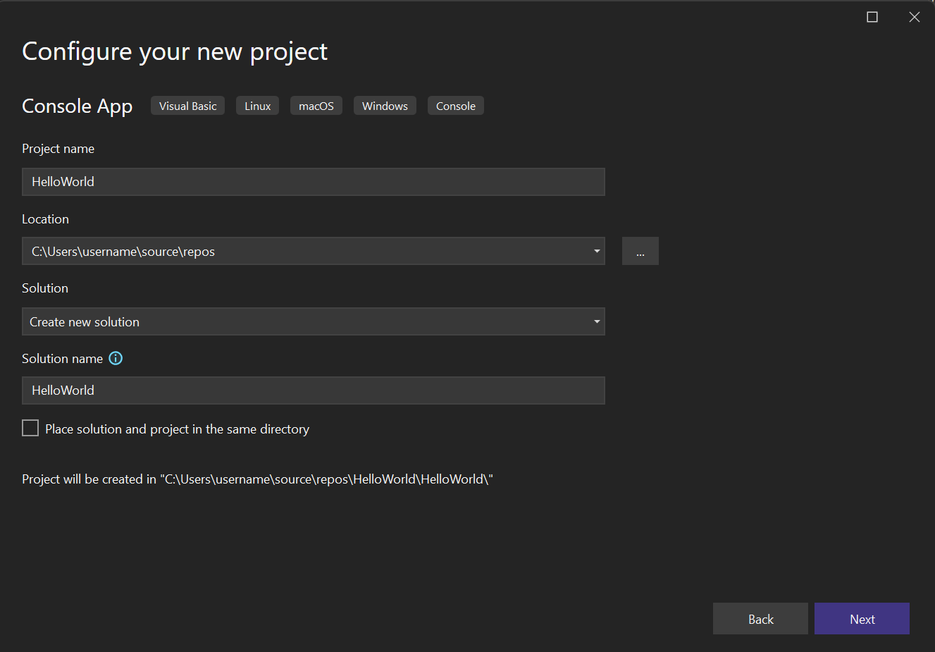 In the Configure your new project window, enter HelloWorld as the Project name. Optionally, change the project directory location from the default location of C:\Users\<name>\source\repos, and then select Next.