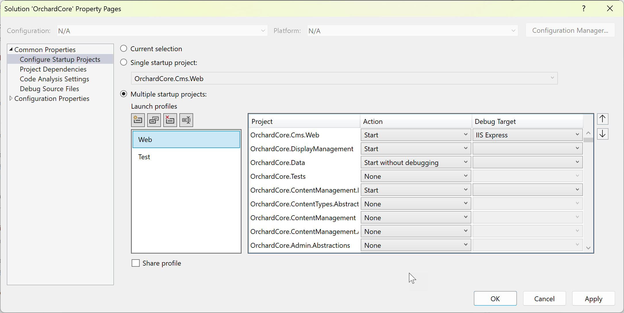.slnLaunchfile:[ { "Name": "Feature Profile", "Projects": [ { "Path": "src\\OrchardCore.Cms.Web\\OrchardCore.Cms.Web.csproj", "Action": "Start" }, { "Path": "src\\OrchardCore\\OrchardCore.DisplayManagement\\OrchardCore.DisplayManagement.csproj", "Action": "Start" }, { "Path": "src\\OrchardCore\\OrchardCore.Data\\OrchardCore.Data.csproj", "Action": "StartWithoutDebugging" }, { "Path": "src\\OrchardCore\\OrchardCore.ContentManagement.Display\\OrchardCore.ContentManagement.Display.csproj", "Action": "Start" } ] } ]After you configure the startup action for each project, select the OK or Apply button to save the profile. The created launch profile appears in the toolbar dropdown list, allowing you to select the profile you want to debug.