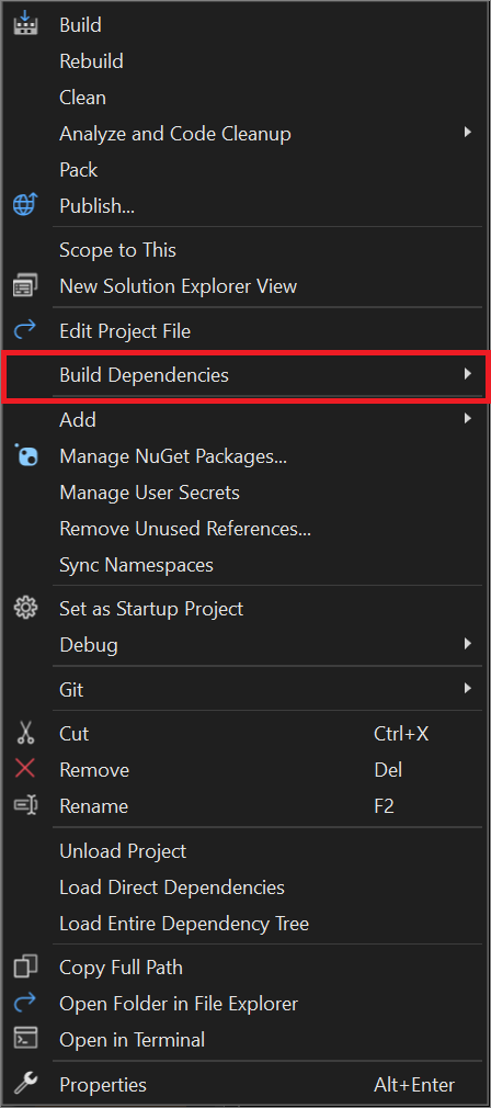 What you see in the context menu from the Project node also depends on your project type, programming language, or platform. The following screenshot highlights the following extra option for a C# app: a Build Dependencies fly-out menu. Extra options typically appear when you add another project to a solution and then add it to a repo.