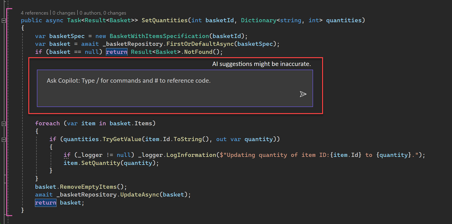 Type your coding related question in the Ask Copilot text box, and then select Enter or select Send to ask your question.