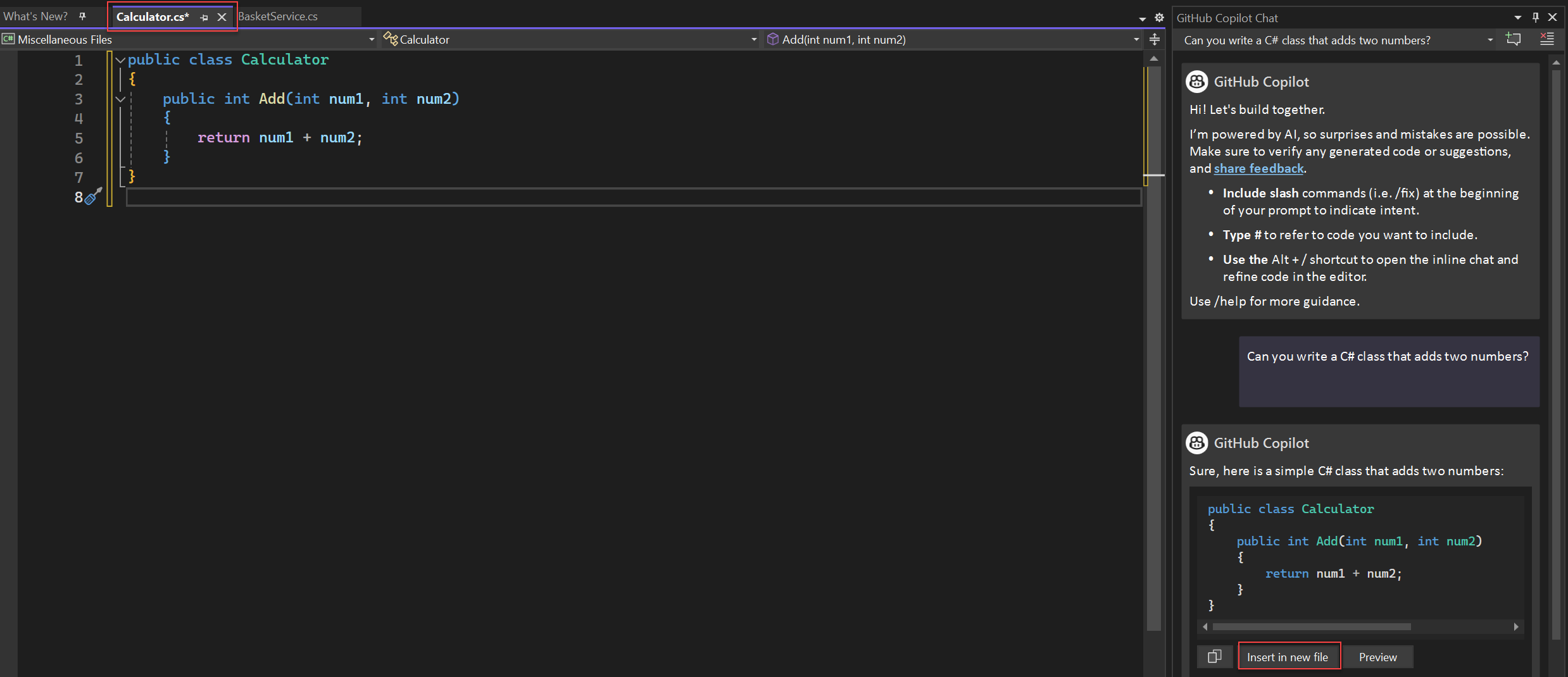If Copilot Chat offers a code suggestion that you want to use, you have the following options. Select Copy code block to copy the code suggestion, Insert in new files to insert the code suggestion in a new file, or Preview to insert the code suggestion in your current code file. If you select Preview, you can preview the code in the target location so you can easily see what's being updated.