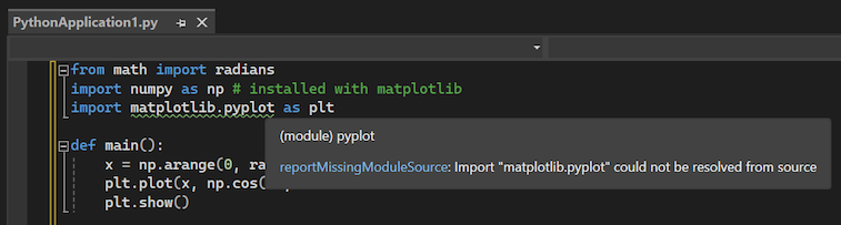 matplotlibimport statement. Visual Studio uses special formatting to indicate the statement is unresolved.The