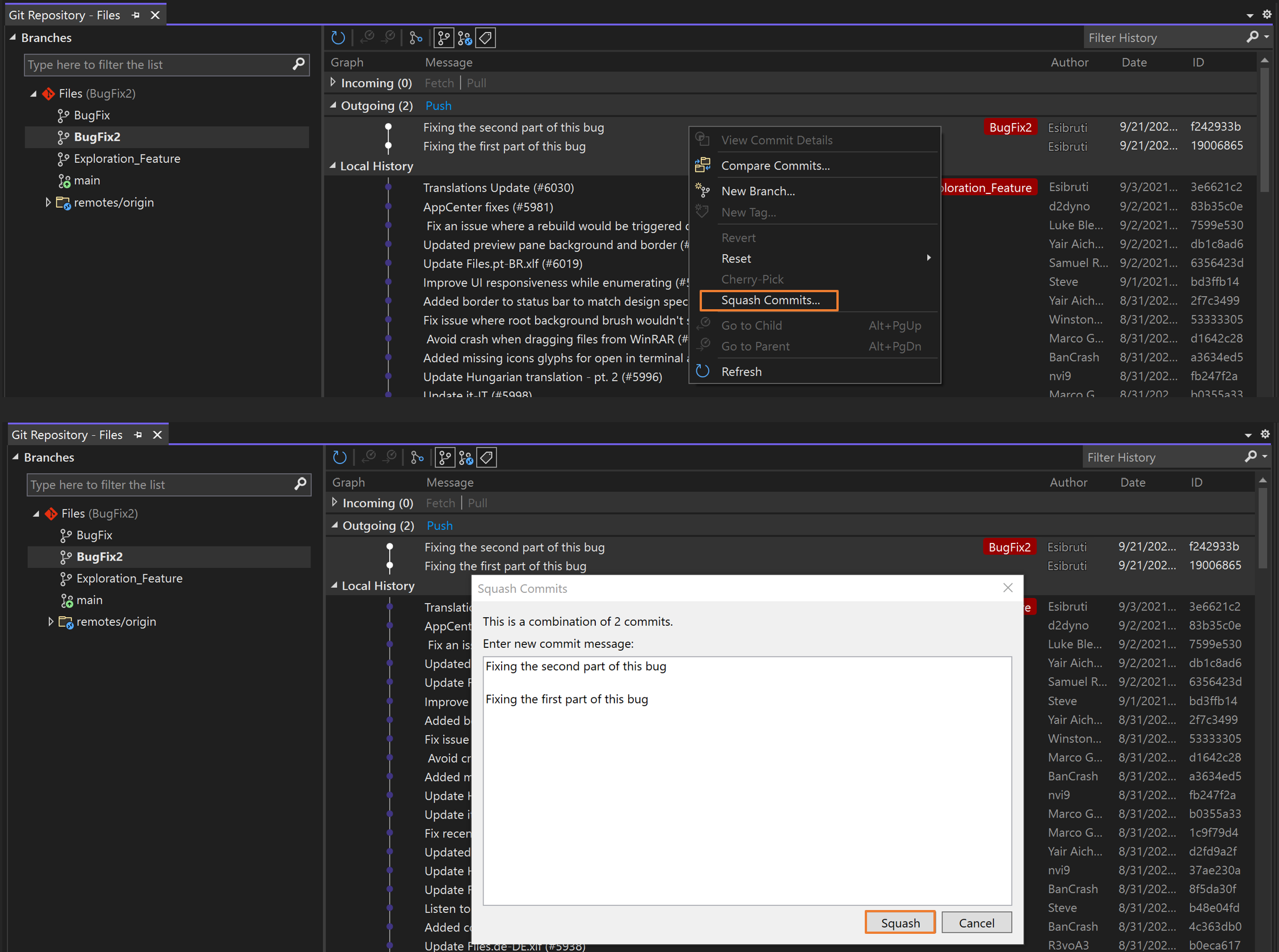 To merge commits in Visual Studio, use the Ctrl key to select multiple commits that you want to merge. Then right-click and select Squash Commits. Visual Studio automatically combines your commit messages, but sometimes it's better to provide an updated message. After you review and update your commit message, select the Squash button.