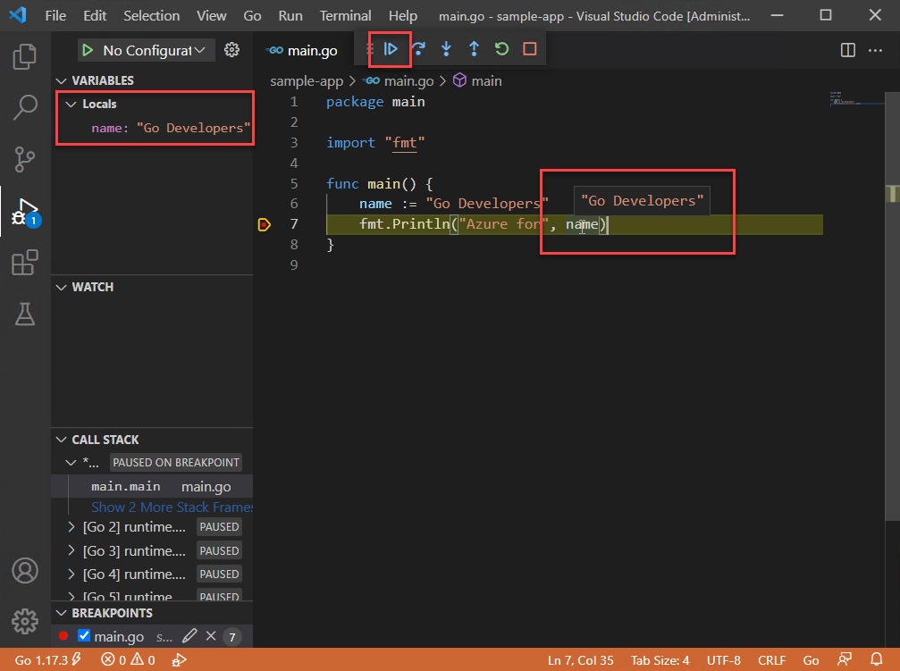 In this quickstart, you install the Go compiler and tools, install Visual Studio Code to write Go code, and install the Go for Visual Studio Code extension which provides support while writing Go. Once configured, you create an application, run it, and use the debugging tool to pause execution and observe the value of variables.