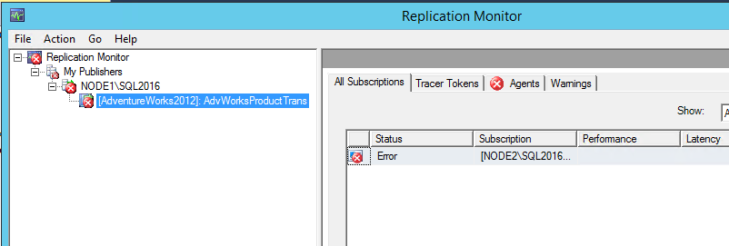 Check Replication Monitor again, by right-clicking Replication in Object Explorer. A red X under All Subscriptions indicates that the Distribution Agent is still encountering an error.