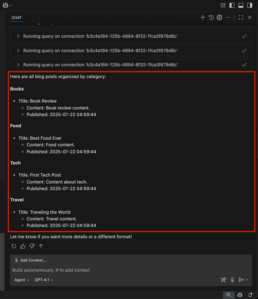 You can also use chat variables like #mssql_connect to invoke these tools directly, or write prompts in natural language such as: