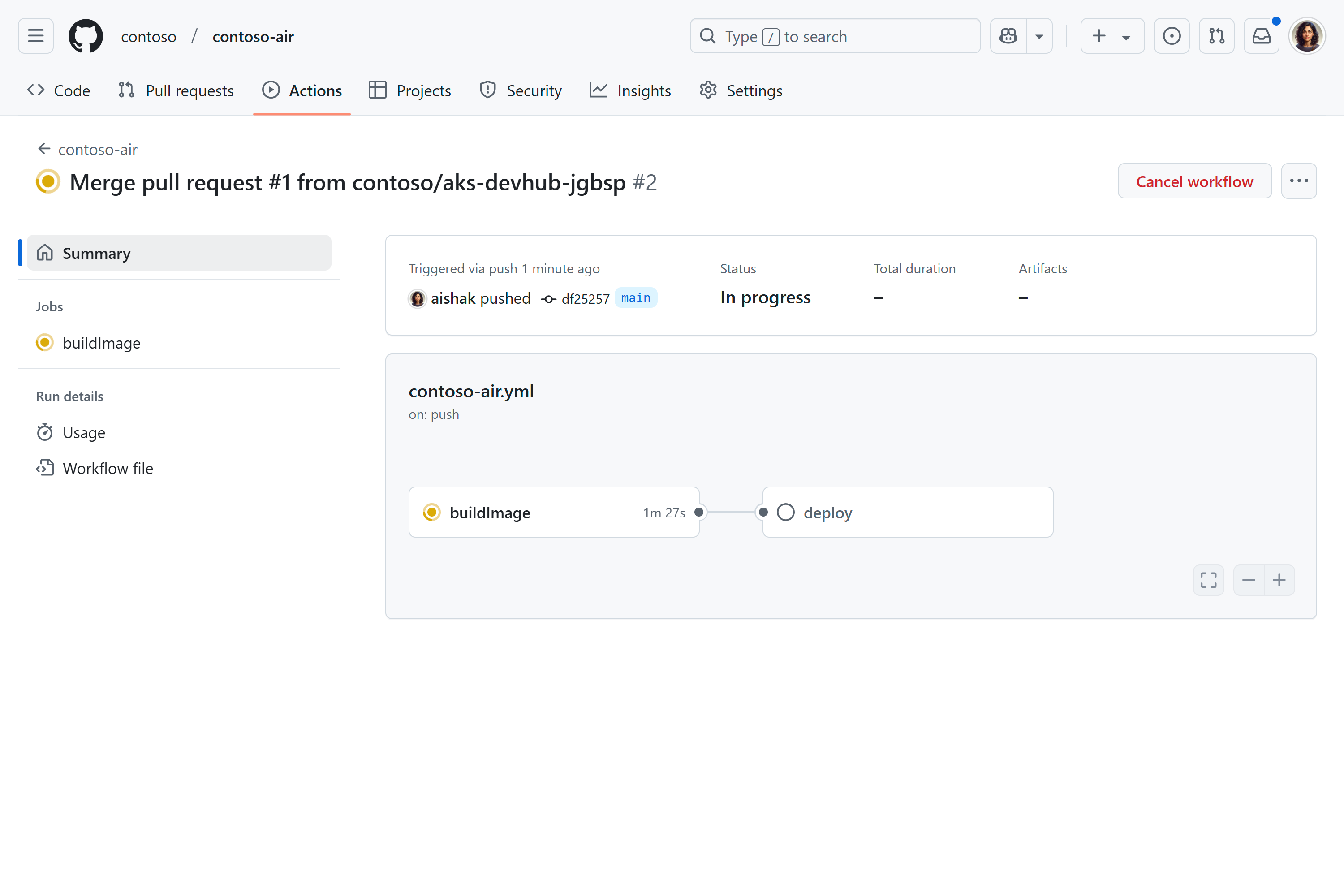 La fusione della modifica esegue il flusso di lavoro di GitHub Actions, che costruisce la tua applicazione in un'immagine del container, la archivia in Registro Azure Container e la distribuisce nel cluster.