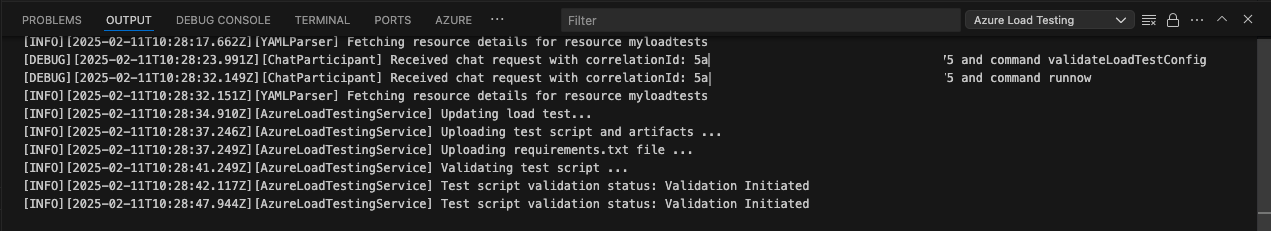 Copilot convalida la configurazione prima dell'esecuzione. Seguire le istruzioni fornite nella finestra della chat. In caso contrario, se viene estratto tutto, lo script di test e i relativi artefatti vengono caricati in Test di carico di Azure e preparati per l'esecuzione. Questo processo può richiedere fino a un minuto e lo stato di avanzamento viene visualizzato nel pannello Output .