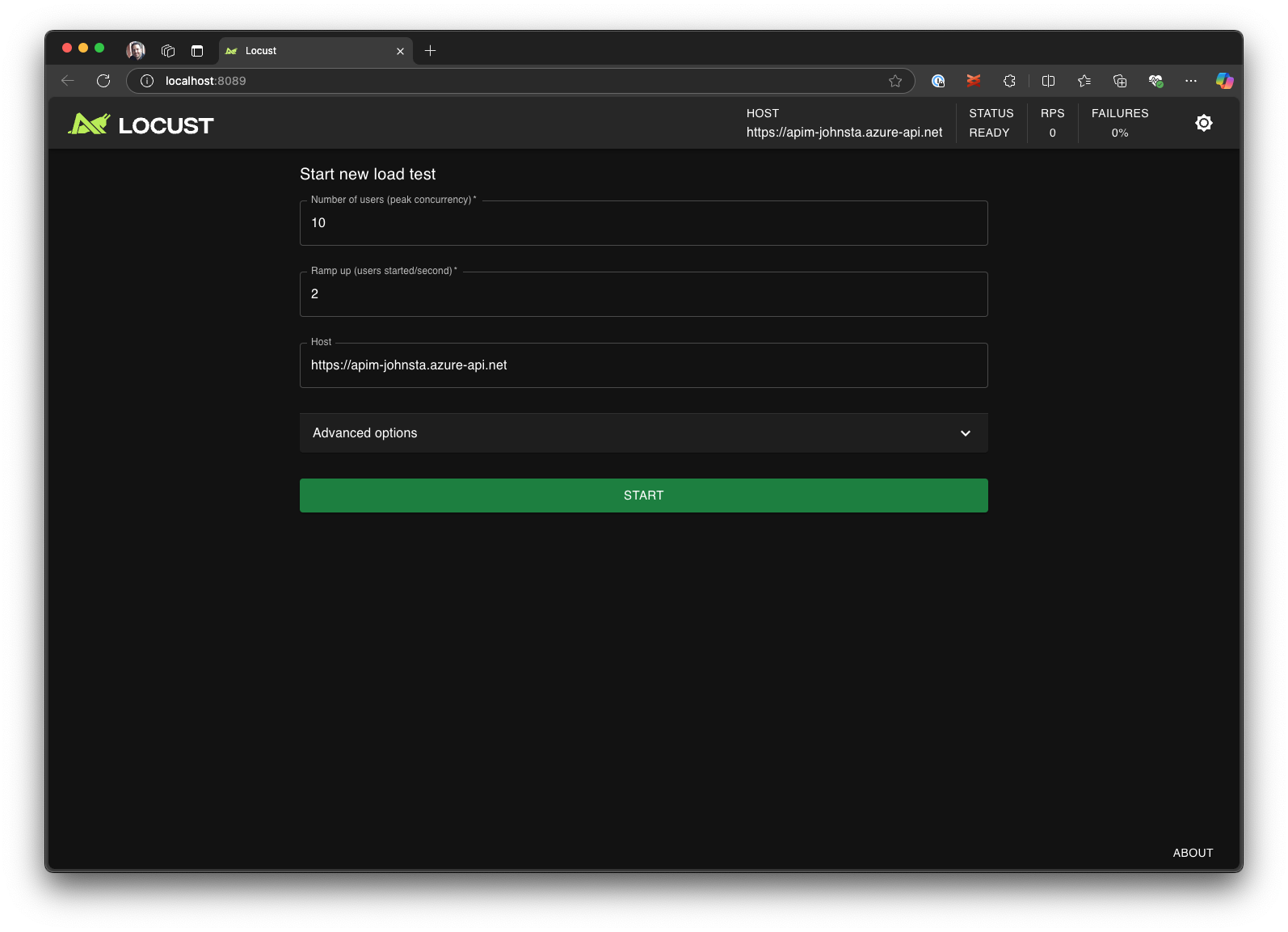 L'interfaccia utente Web Locust viene avviata automaticamente in un browser. L'apertura del browser può richiedere alcuni secondi prima che il server Locust sia pronto e che il browser si apra.