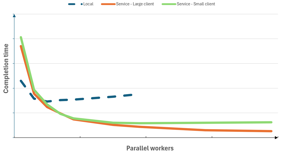 Il grafico seguente offre un esempio di esecuzione di un gruppo di test. Eseguendo il gruppo di test con Playwright Workspaces anziché localmente, è possibile aumentare significativamente il parallelismo e ridurre il tempo di completamento del test. Si noti che, quando si esegue con il servizio, il tempo di completamento raggiunge un limite minimo, dopo il quale l'aggiunta di più ruoli di lavoro ha solo un effetto minimo. Il grafico mostra anche come l'uso di più risorse di calcolo nel computer client influisce positivamente sul tempo di completamento dei test per i test in esecuzione con il servizio.