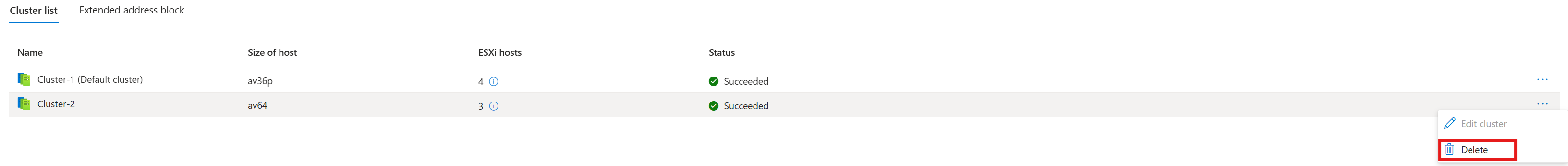 Selezionare il cluster da eliminare, selezionare Altro (...), selezionare Elimina.