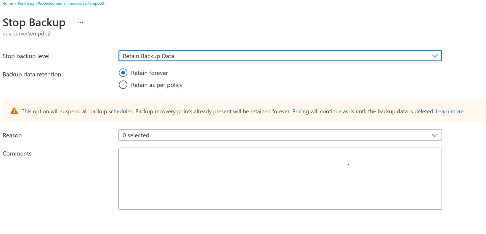 Arrestare il backup e conservare i dati per sempre: questa opzione consente di arrestare tutti i processi di backup futuri per il server di Database di Azure per PostgreSQL. Tuttavia, il servizio Backup di Azure mantiene i punti di ripristino di cui è stato eseguito il backup per sempre. È necessario pagare per mantenere i punti di ripristino nell'insieme di credenziali. Per informazioni dettagliate, vedere Prezzi di Backup di Azure. È possibile eseguire il ripristino da questi punti di ripristino, se necessario. Per riprendere i processi di backup, usare l'opzione Riprendi backup .