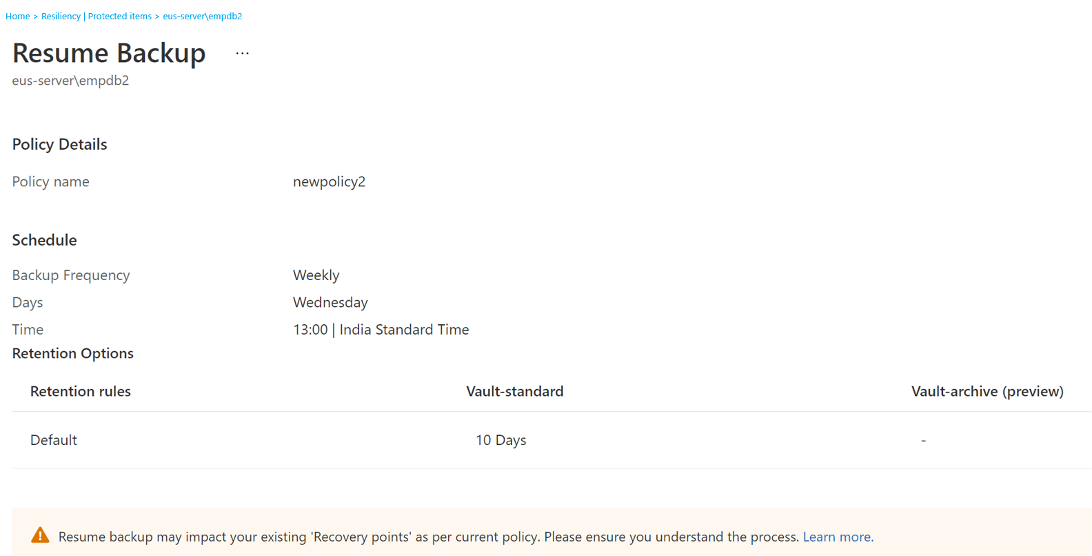 Quando si riprende a proteggere un'istanza di backup, i criteri di backup esistenti iniziano a essere applicati solo ai nuovi punti di ripristino. I punti di ripristino già scaduti in base alla durata di conservazione originale, come definito dai criteri di backup in vigore al momento della creazione, vengono eliminati.