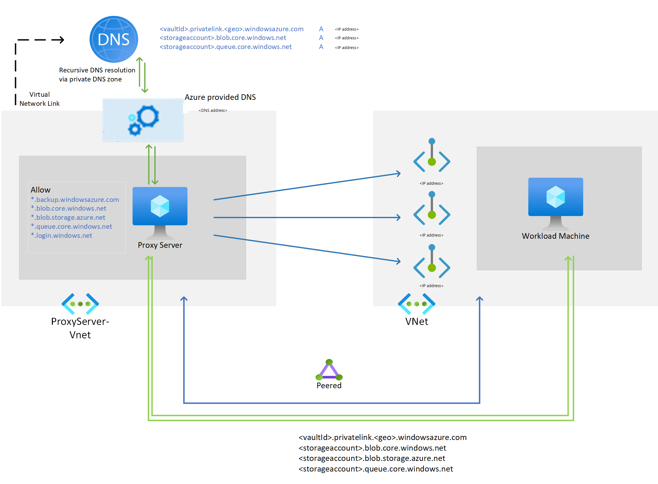 *.privatelink.<geo>.backup.windowsazure.com,*.privatelink.blob.core.windows.net,*.privatelink.queue.core.windows.net) alla rete virtuale in cui viene creato il server proxy o usa un server DNS personalizzato con le rispettive voci DNS.