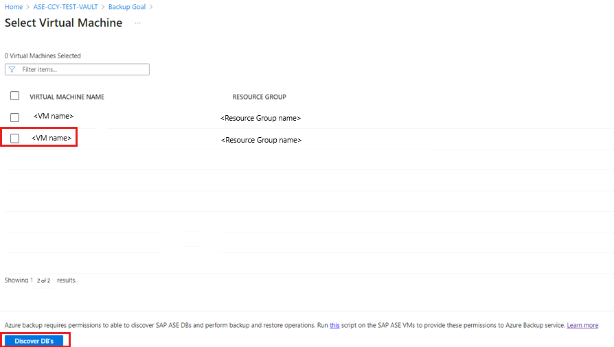 Nel riquadro Seleziona macchine virtuali, scarica lo script prepost che fornisce le autorizzazioni al servizio Backup di Azure per accedere alle macchine virtuali SAP ASE per l'individuazione del database.