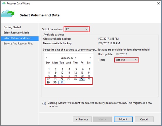 Nella pagina Seleziona volume e data selezionare il volume contenente i file o le cartelle da ripristinare e selezionare Monta. Selezionare una data e selezionare un'ora dal menu a discesa corrispondente a un punto di ripristino. Le date in grassetto indicano la disponibilità di almeno un punto di ripristino per quel giorno.