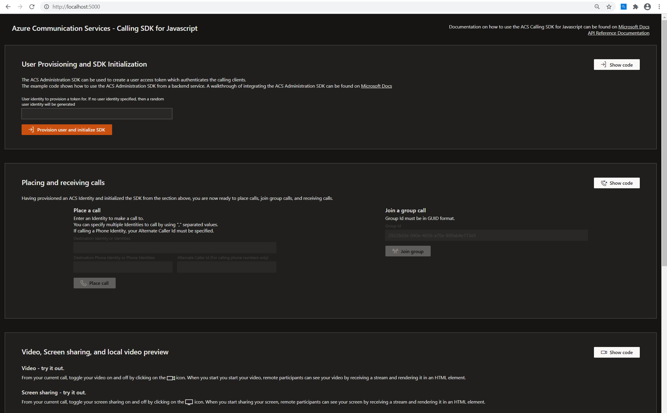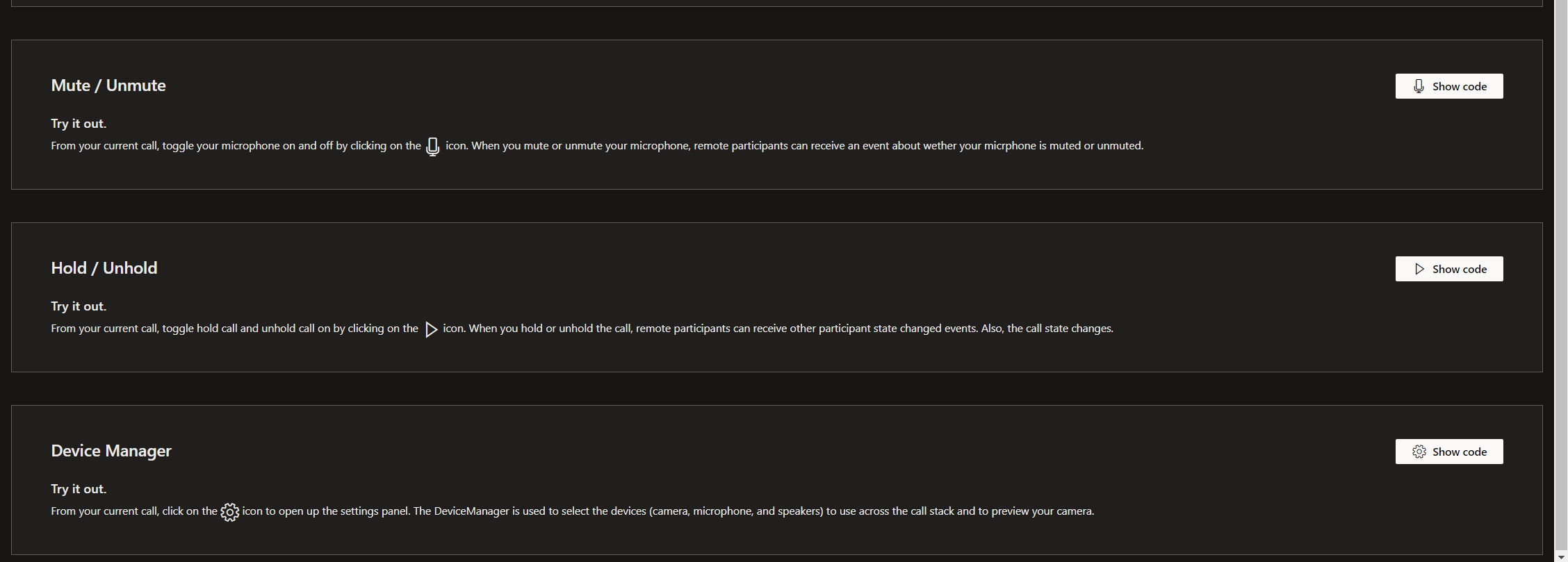 Fare clic sul pulsante "Show code" (Mostra codice) per visualizzare il codice di esempio per effettuare chiamate, ricevere chiamate e partecipare a chiamate di gruppo.