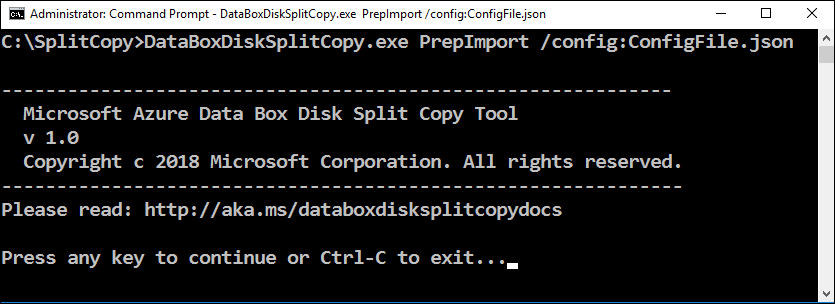 DataBoxDiskSplitCopy.exeusando il comando seguente.DataBoxDiskSplitCopy.exe PrepImport /config:ConfigFile.jsonQuando richiesto, premere un tasto qualsiasi per continuare a eseguire lo strumento.