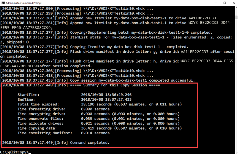 Dopo la suddivisione e la copia del set di dati, il riepilogo dello strumento Split Copi per la sessione di copia viene presentato come illustrato nell'output di esempio seguente.